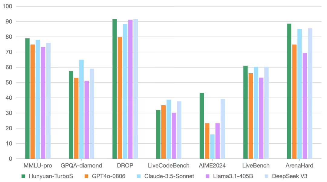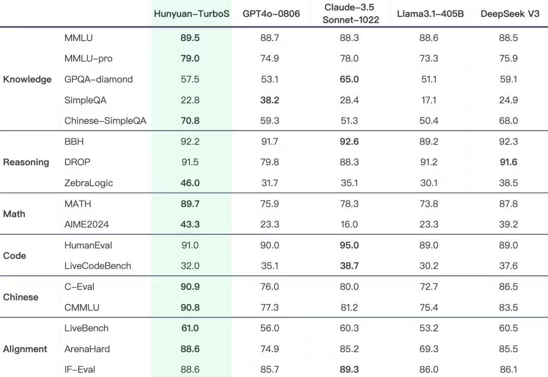 在业界通用的多个公开 Benchmark 上,混元 Turbo S 在知识、数学、推理等多个领域,展现出对标 DeepSeek V3、GPT 4o、Claude 等一系列业模型的效果表现。